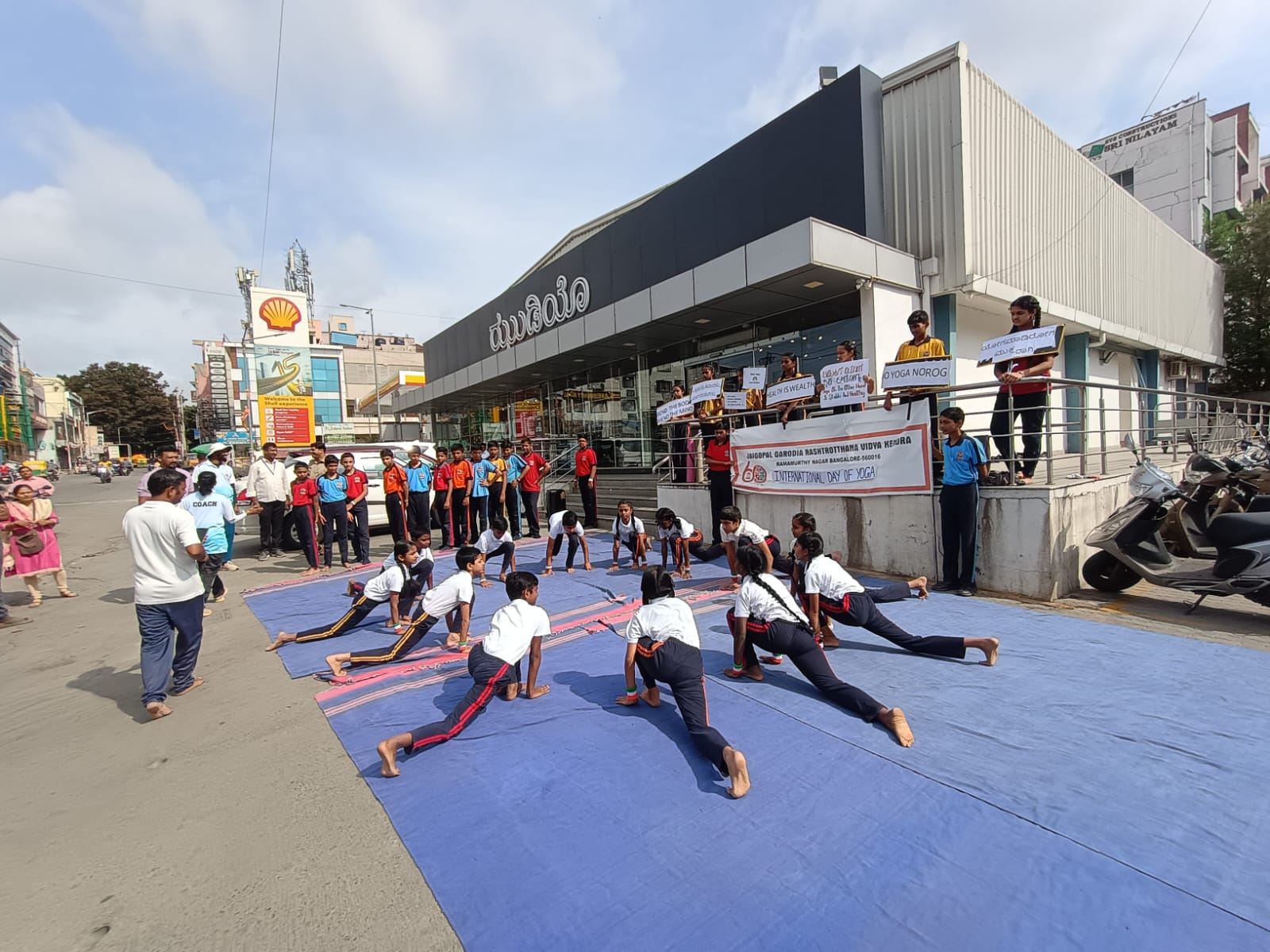 50 students performed yoga in front of the Zudio and Khadi Bhandar in Ramamurthy Nagar. Kumari Sivagami and Kumar Atharv spoke about the benefits of yoga in daily life.