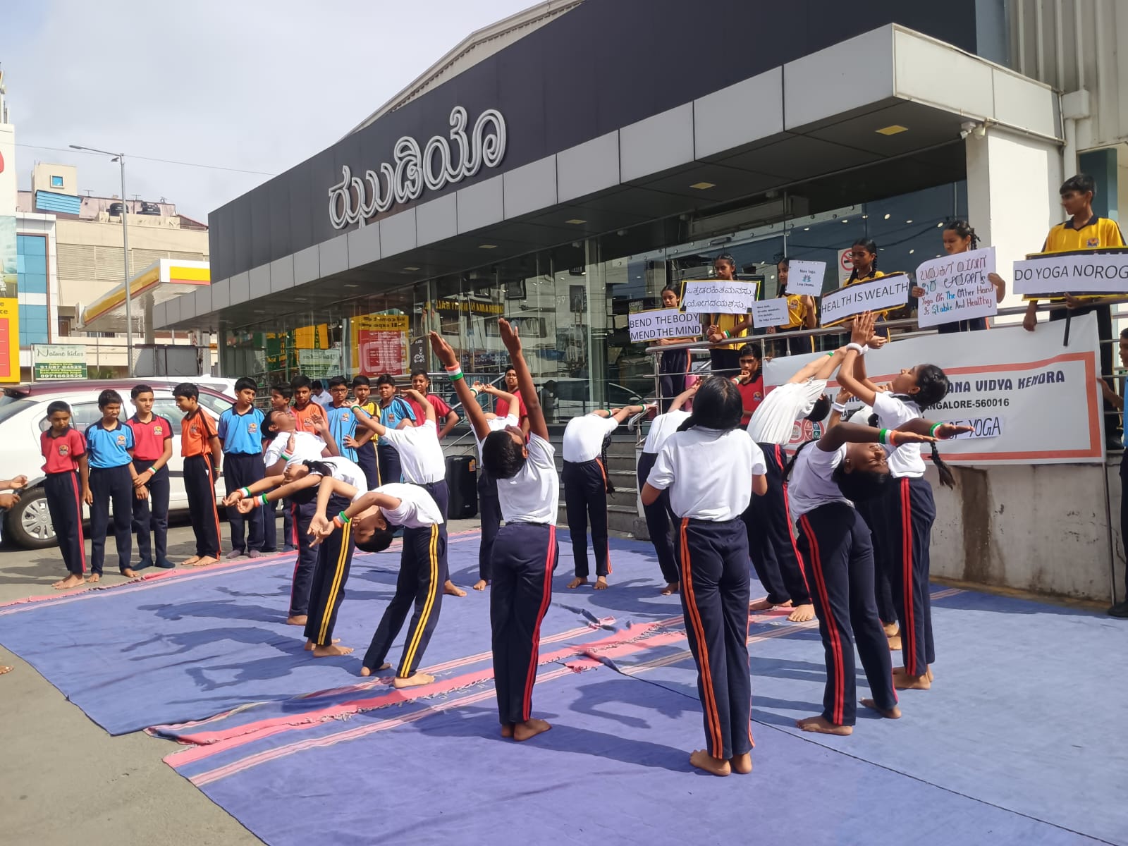 50 ವಿದ್ಯಾರ್ಥಿಗಳು ರಾಮಮೂರ್ತಿ ನಗರದ ಝುಡಿಯೋ ಮತ್ತು ಖಾದಿ ಭಂಡಾರದ ಎದುರು ಯೋಗವನ್ನು ಪ್ರದರ್ಶಿಸಿದರು. ಕುಮಾರಿ ಶಿವಗಾಮಿ ಮತ್ತು ಕುಮಾರ್ ಅಥರ್ವ್ ದೈನಂದಿನ ಜೀವನದಲ್ಲಿ ಯೋಗದ ಲಾಭದ ಕುರಿತು ಮಾತಾಡಿದರು.