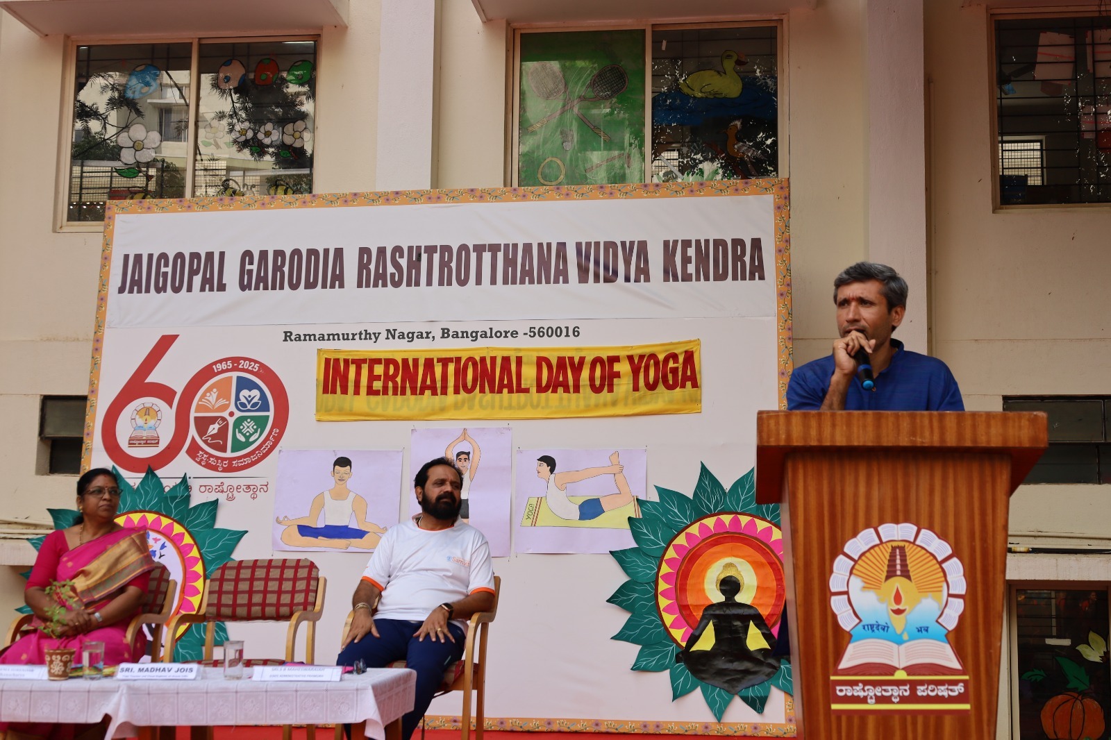 Sri Madhav Jois, Rashtrotthana Yoga Teacher and Cloud Engineer at Oracle India, was the chief guest and spoke about the importance of yoga in daily life.