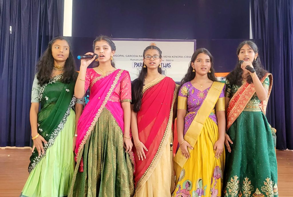 Bengaluru, Jan. 23: Vasant Panchami and Parakram Diwas were celebrated herein Jaigopal Garodia Rashtrotthana Vidya Kendra – Ramamurthy Nagar. The students of class 2 beautifully explained the importance of Vasant Panchami, highlighting the essence of knowledge, wisdom and learning. Matruchaya students and Nihal of class 9 spoke with remarkable confidence about the invaluable contribution of Netaji Subhas Chandra Bose to the Indian freedom struggle. Devotional songs were offered to Goddess Saraswati with musical instruments like Veena and Mridangam. Students of classes 4 and 9 performed a group dance. In each class, the students performed puja with their class teachers.