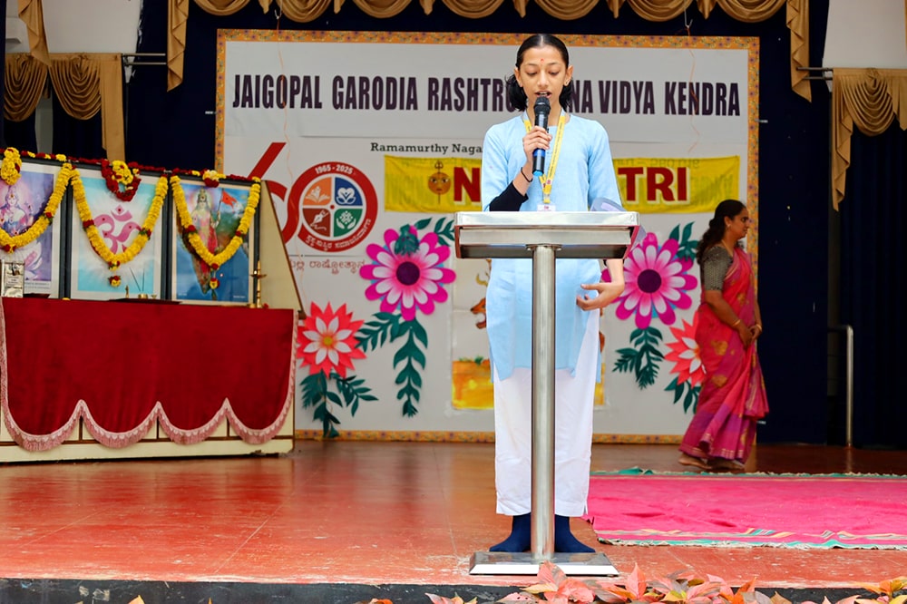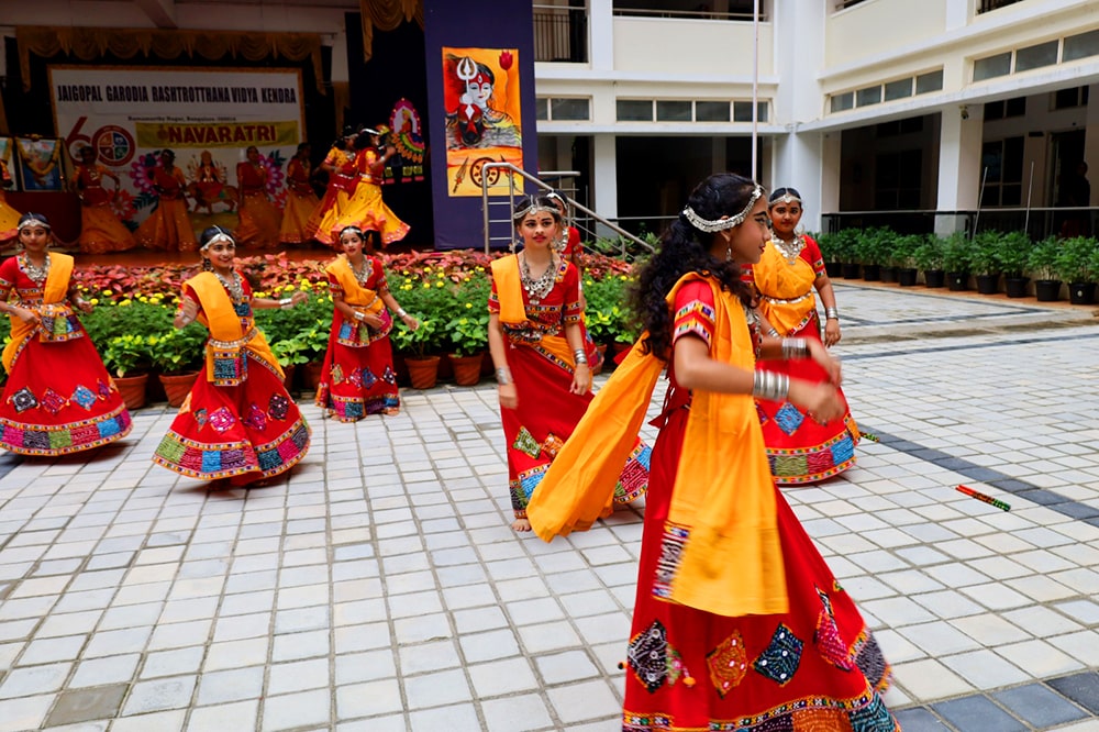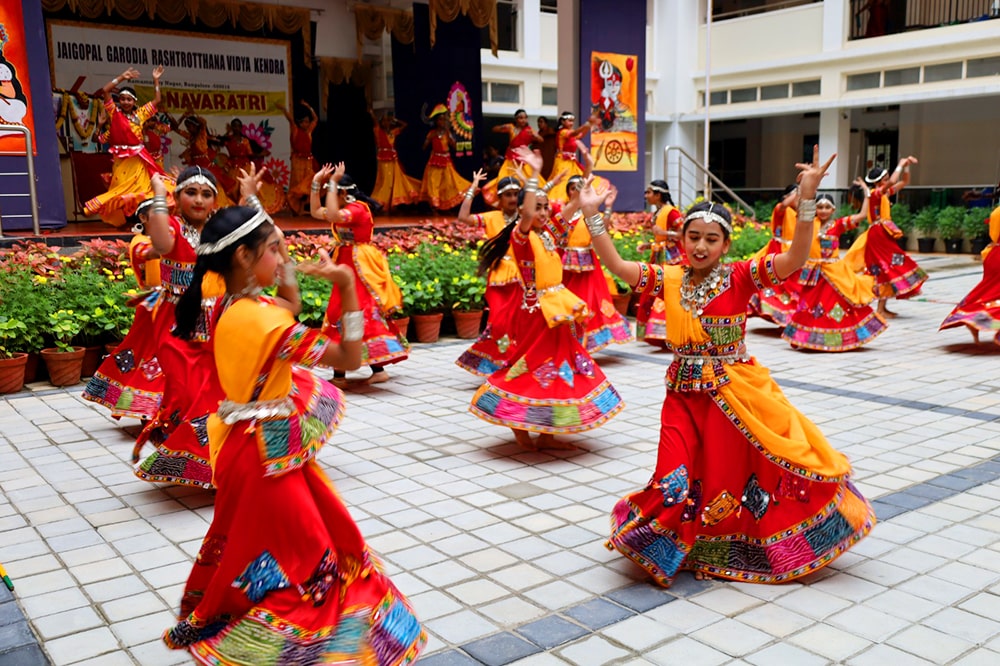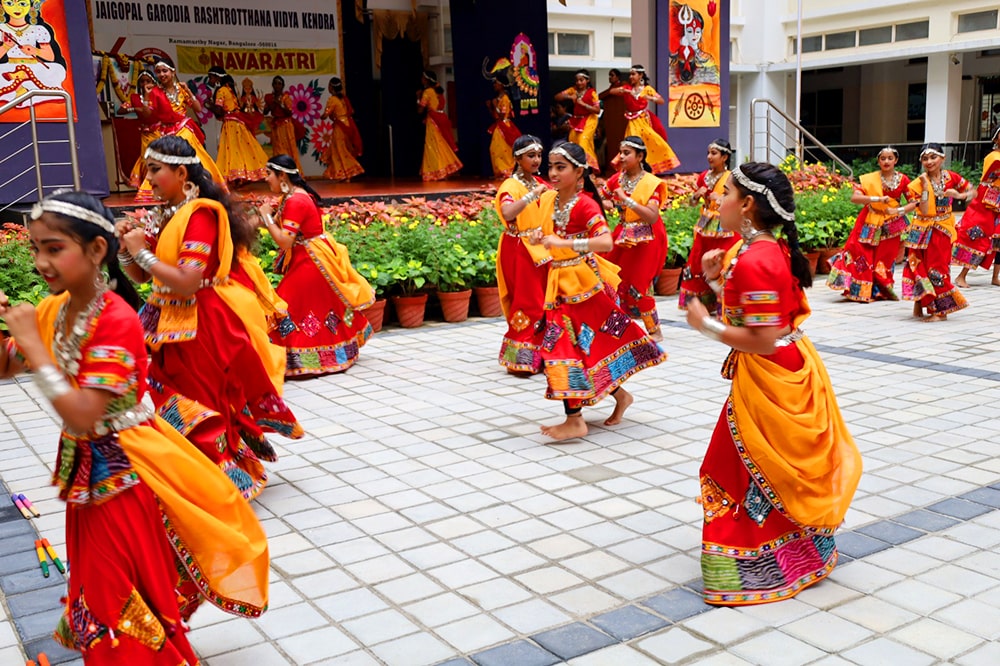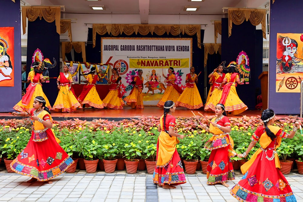 Bengaluru, Sept. 20: Navratri Mysuru Dasara, also known as Nadahabba and officially recognized as Karnataka State Festival, was celebrated herein Jaigopal Garodia Rashtrotthana Vidya Kendra – Ramamurthy Nagar. The program began with an informative speech on Navaratri by the students, who explained the importance of the nine nights of devotion, dance and celebration. There was a wonderful Garba dance performance by the students.