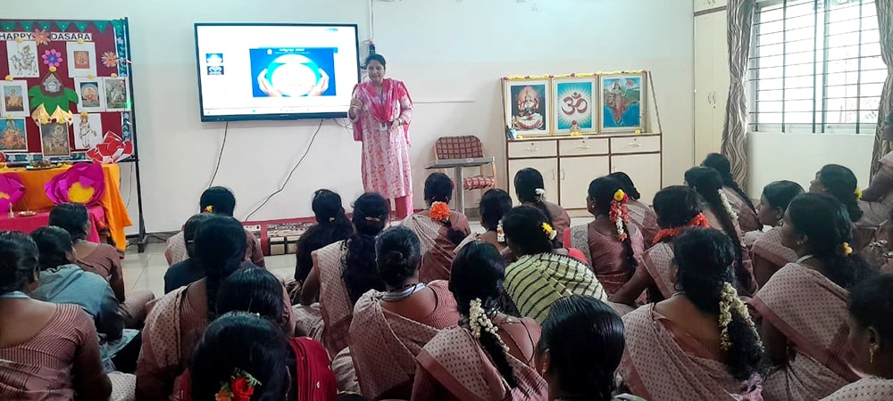 Bengaluru, Sept. 19: Herein Jaigopal Garodiya Rashtrotthana Vidya Kendra – Ramamurthy Nagar, during the RP @ 60 – Panchamukhi Education and Panchaparivartana RP@60 event, Smt. Roopashree, Matrichhaya department, addressed the sub-staff on the fivefold activities of Panchamukhi Education and Panchaparivartana, which include environmental conservation, family enlightenment, civic etiquette, nationalism, and social harmony.