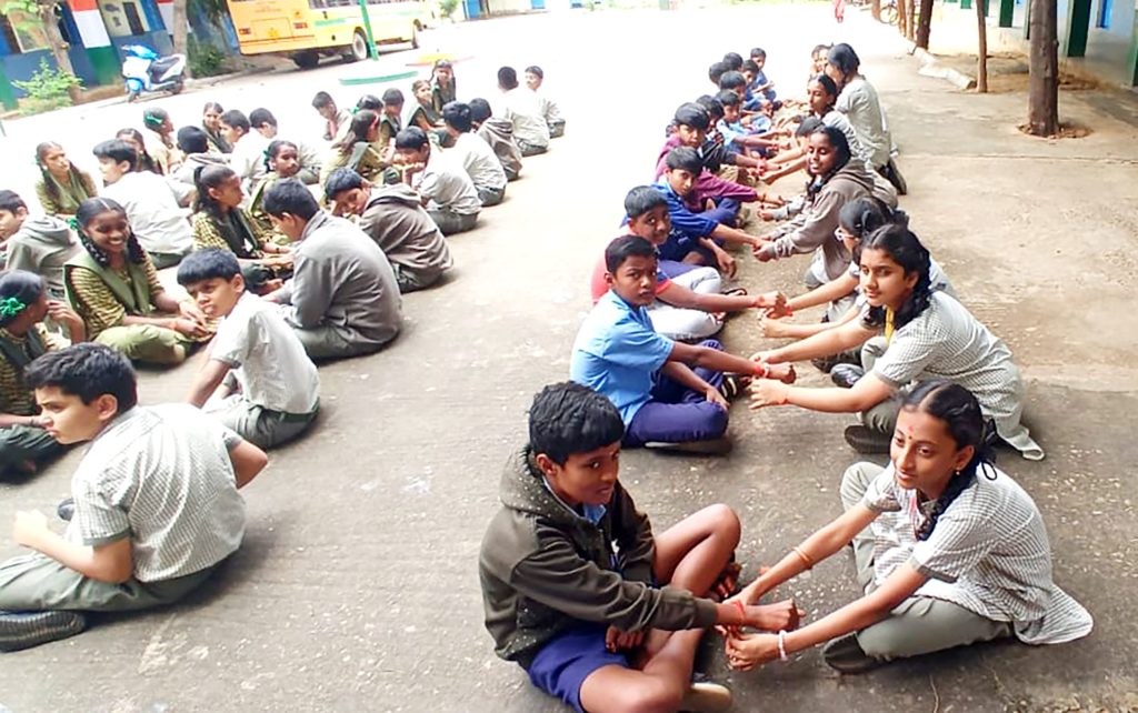 Bengaluru, Aug. 11: Raksha Bandhan was observed in 12 government schools as part of a service activity herein Jaigopal Garodia Rashtrotthana Vidya Kendra – Ramamurthy Nagar. The children explained the importance of Raksha Bandhan and its cultural and emotional value. At the end of the program, everyone tied Rakhi to each other.