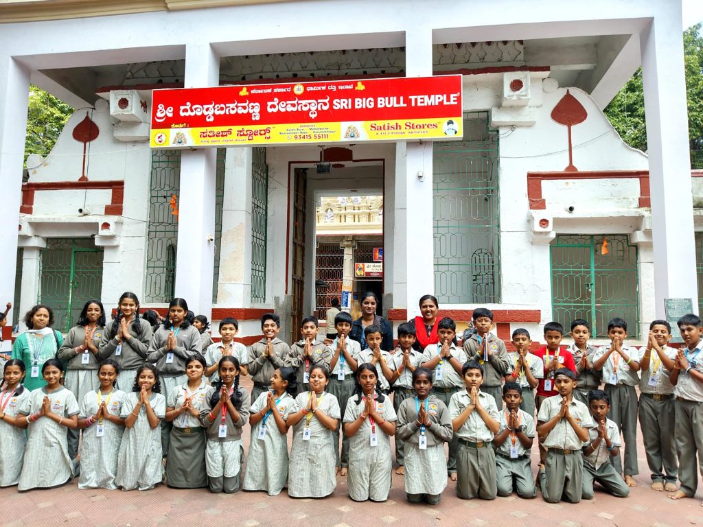 Bengaluru, Aug. 4: A spiritual tour was organized for the students of class 5 of Jaigopal Garodia Rashtotthana Vidya Kendra – Ramamurthy Nagar. The students visited the Bull Temple in Basavanagudi. Under the guidance of experts, the students learned about the rich history, cultural significance and tradition of the temple.