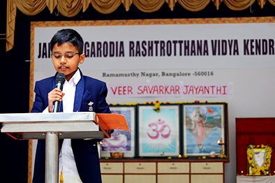 Bengaluru, May 28: Veer Savarkar Jayanti was celebrated herein Jaigopal Garodia Rashtrotthana Vidya Kendra – Ramamurthy Nagar.Students shared stories about Savarkar’s life, his patriotism, and selfless struggle.